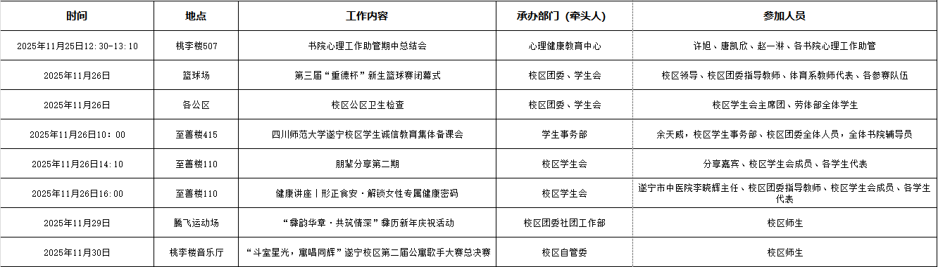 >>遂宁校区综管委学生事务部(校区团委)主要工作安排(2025年11月24日-11月30日)