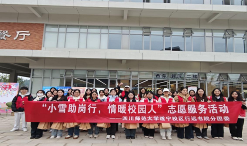 11 月 22 日小雪节气当天,四川师范大学遂宁校区行远书院分团委组织30余名学生志愿者,在西苑广场开展“小雪助岗行,情暖校园人”志愿活动。志愿者深入食堂、保洁、宿管、安保、维修等校园服务一线,送关怀、助实践,推动师生与服务人员双向关怀,为冬日校园添暖意。