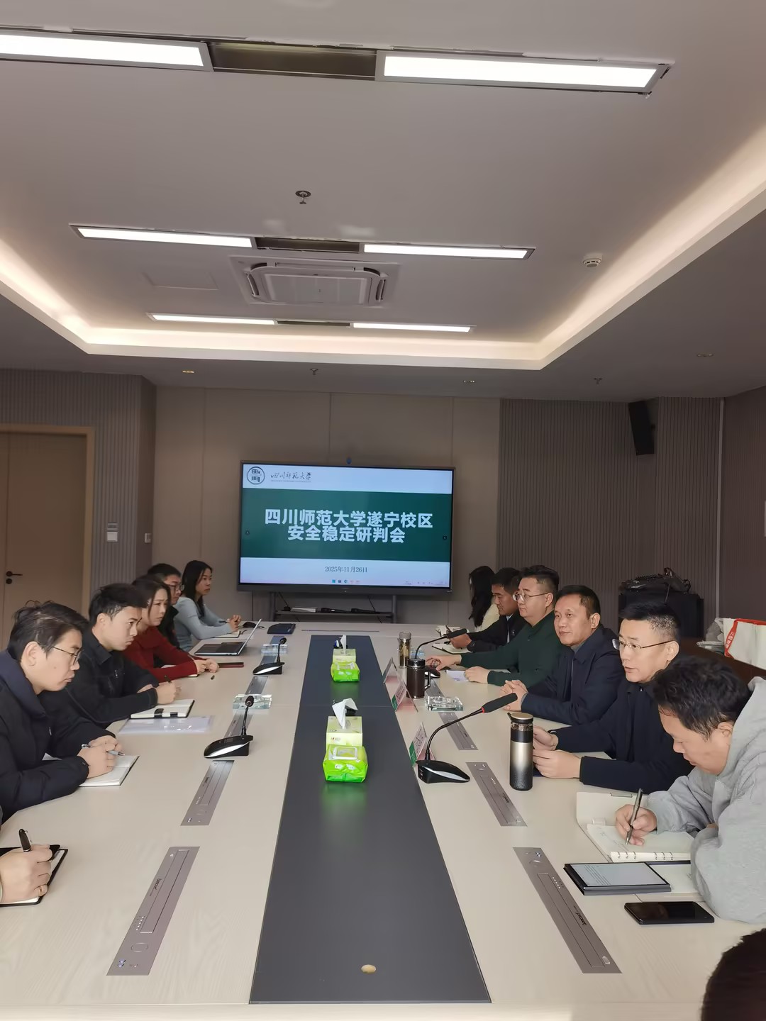 2025年11月26日上午,四川师范大学遂宁校区在至善楼415会议室召开安全稳定工作研判会。遂宁校区党委常务副书记饶显周、校区综管委常务副主任李兴聪、校区党委副书记余天威出席会议。遂宁校区学生事务部负责人、安全保卫部负责人及全体书院辅导员参加会议。会议由余天威主持。