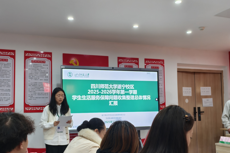 11月27日,由四川师范大学遂宁校区学生社区自我管理委员会承办的2025-2026学年第一学期生活权益服务保障工作联席会在竹苑2栋党员活动室举行。校区党委副书记余天威、校区综管委副主任谭英出席会议。校区学生事务部、后勤事务部、安全保卫部相关负责人及校区后勤生活保障项目运营方代表,各书院班级生活委员代表及学生社区自管委学生生活权益服务部全体成员参加会议。会议由校区学生事务部负责人秦绍林主持。