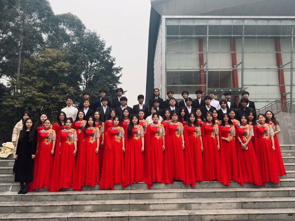 此次参赛工作得到遂宁校区党委的高度重视,校区团委精心统筹推进。为在赛场展现最佳风貌,来自校区多个年级专业的50名参赛队员组成临时合唱团,开启了为期一个月的集中排练。面对学业与排练双重压力,队员们克服专业差异大、合练时间紧等困难,在李德隆教授与音乐学系专任教师郭超的专业指导下,逐字校准音准、逐句打磨情感。排练现场,指挥陈杏精准把控节奏,钢琴伴奏段翔耀以灵动旋律铺垫基调,李昊洋、峨毛宇航的中国鼓表演更添磅礴气势,带队老师康雅洁、余江林全程跟进保障,师生同心协力将对祖国的赤诚与青春的热忱融入每一个音符。