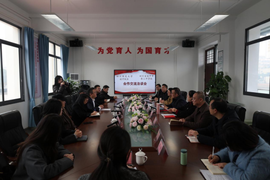 12月11日,四川师范大学遂宁校区与遂宁市第二中学校在遂宁二中南校区二楼会议室举行合作交流洽谈会。遂宁二中党委书记柴文斌,校长吴丽君,副校长丰严冬、曾佳、李青山、唐博,遂宁校区党委副书记余天威、教学事务部负责人丁明鲜出席会议,相关部门负责人、系主任参加会议。会议由吴丽君主持。