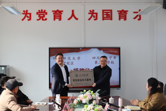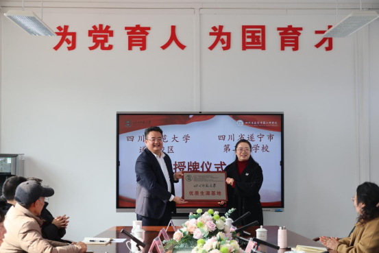 会上,余天威向遂宁二中授予“四川师范大学优质生源基地”与“四川师范大学学生就业实习基地”牌匾,柴文斌、吴丽君代表遂宁二中接牌。两大基地的设立标志着两校合作进入制度化、常态化的新阶段,为后续双方开展师资共建、课程共享、招生就业、实践共育奠定了坚实基础。