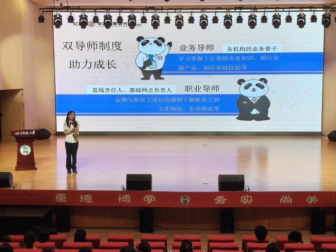 一位现就职于工行的川师优秀毕业生也上台分享了其职业成长历程。他提到,工行的导师制度和晋升机制为其职业发展提供了有力支持,增强了在场学子对加入工行的信心。