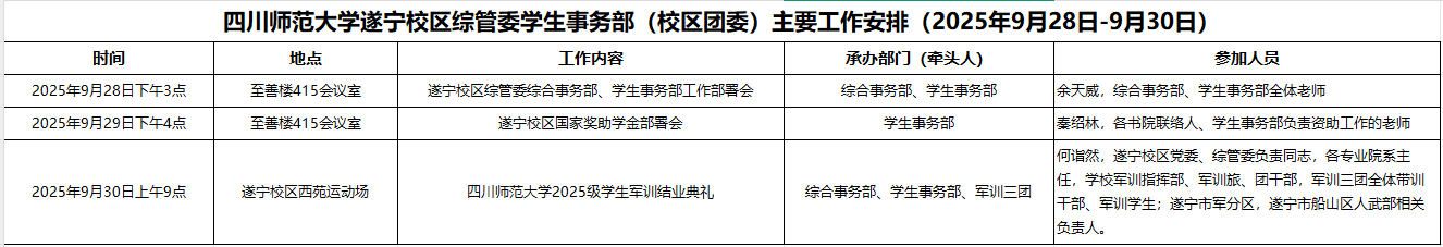 >>四川师范大学遂宁校区综管委学生事务部(校区团委)主要工作安排(2025年9月28日-9月30日)