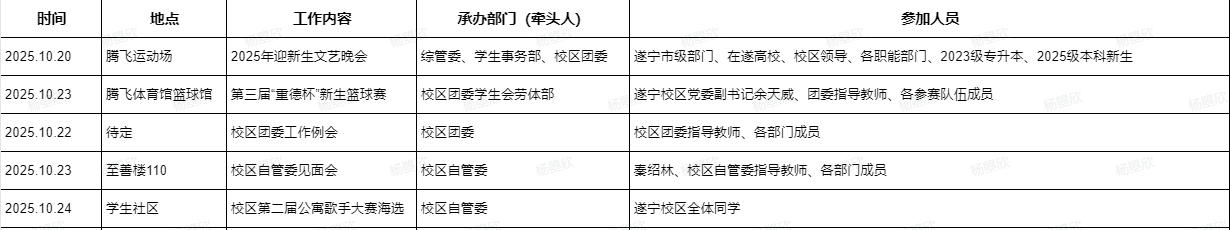遂宁校区综管委学生事务部(校区团委)主要工作安排(2025年10月20日-10月26日)