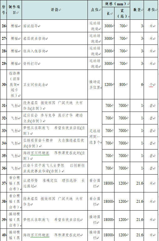 (二)项目采购的内容:1、“秋季双选会”主席台及背景的设计、物料搭建(至少含尺寸与典礼现场规模匹配的1个主背景板);2、保障活动开展的桌椅凳、桌布等现场所需的物资保障;3、现场的氛围营造桁架、横幅、标识牌以及其他“秋季双选会”氛围营造的物料。★具体物料、服务包括但不限于以下清单内容: