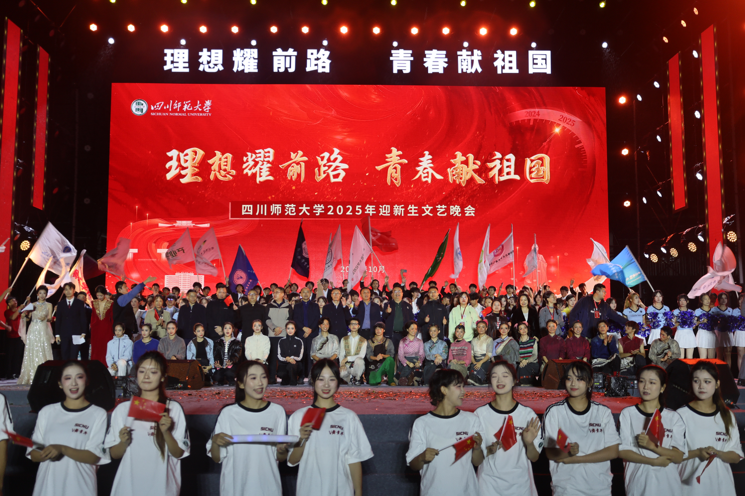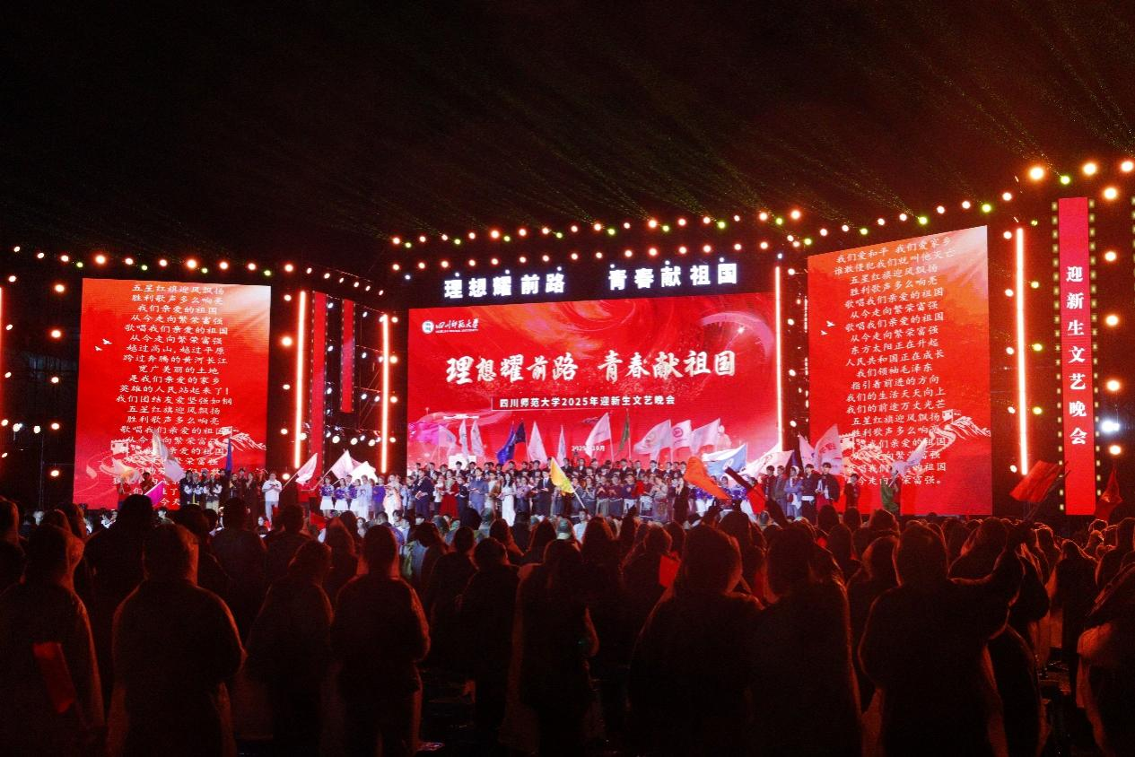 10月20日晚,“理想耀前路,青春献祖国”四川师范大学2025年迎新生文艺晚会在遂宁校区腾飞运动场如约启幕,精彩纷呈。四川师范大学副校长、遂宁校区党委书记、综管委主任何诣然,遂宁市人民政府副秘书长罗红光,市人社局副局长郭正辉,市农业农村局副局长刘罡霏、陈勇,团市委副书记李根延,市教育考试院副院长文武,市河东新区党工委委员、管委会副主任李瑞轩,学校团委主要负责人、遂宁校区党政领导班子成员出席晚会,遂宁市、市河东新区管委会有关部门、相关兄弟单位代表、遂宁校区全体教职工及2025年新生共计5000余人参加活动,共同观看了这场青春盛宴。
