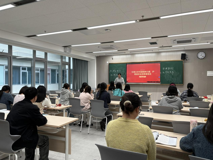 活动开篇,团支书以“烽火中的粮食记忆”为主题开展历史学习。通过播放精心剪辑的革命纪录片片段,团员们直观看到抗日战争、解放战争时期,革命军民在粮食极度短缺的困境下,用“南瓜汤、野菜粥”坚持斗争,甚至以“一粒粮食一颗心”的信念开展大生产运动的历史场景。随后,宣传委员和组织委员结合英语专业特色,分享了“战时粮食援助”相关的英文史料,带领大家用双语视角解读“粮食安全”对国家独立、民族存续的重要意义,现场团员围绕“先辈如何守护‘粮袋子’”展开热烈讨论,纷纷表示从历史中读懂了“每一粒粮食都来之不易”的深刻内涵。