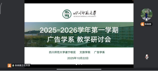 2025年10月22日晚,广告学系通过线上方式组织召开本学期教学研讨会。会议由系主任助理陈晓雅主持,广告学系全体教师参会,围绕当前教学情况反馈、教学材料规范、学生意见回应及课程作品展筹备等核心议题展开交流。