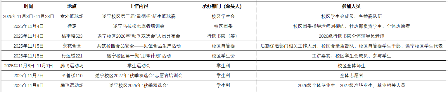>>遂宁校区综管委学生事务部(校区团委)主要工作安排(2025年11月3日-11月9日)