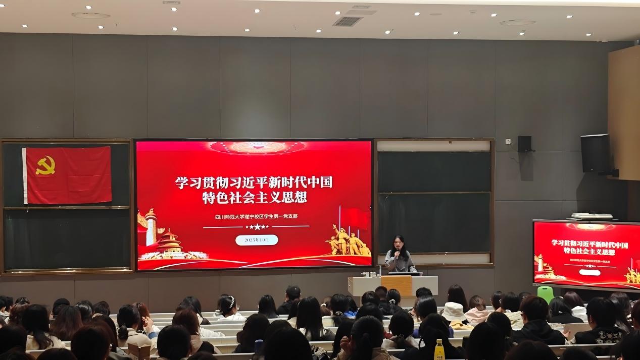10月29日,遂宁校区学生第一党支部于桃李楼110教室召开10月主题党日活动。活动由向珈瑶同志领学,支部全体党员及入党积极分子参加。向珈瑶详细解读学习内容,结合实际案例深入浅出剖析习近平新时代中国特色社会主义思想的内涵实质,引导参会人员深刻领会精神要义。活动组织观看专题视频资料后,参会人员踊跃交流心得,纷纷表示将坚定理想信念,把理论成果转化为践行使命担当的实际行动。