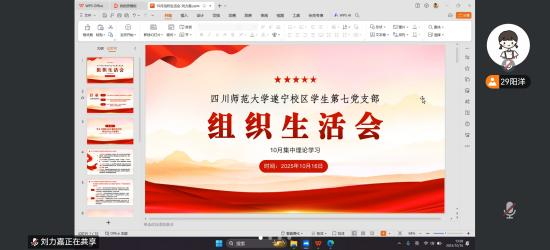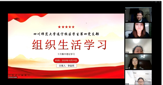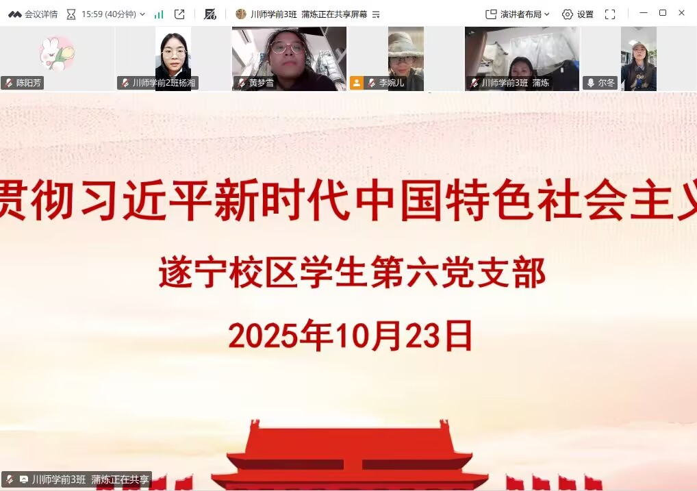 10月16日,遂宁校区学生第七党支部通过线上召开“深学细悟新思想 青春奋进新征程”10月专题理论学习会,活动由刘力嘉同志领学,支部全体党员参加。会议聚焦习近平新时代中国特色社会主义思想、总书记重要讲话及二十届四中全会精神,党员们结合专业学习与社会实践发言,一致认为党的创新理论是成长成才的“指南针”和 “压舱石”。大家表示将持续深化学习,在日常中践行党员使命,努力成长为堪当民族复兴重任的时代新人。