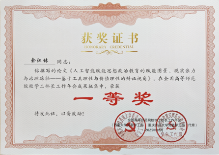 此次评选中,余江林老师的论文《人工智能赋能思想政治教育的赋能图景、现实张力与治理路径-基于工具理性与价值理性的辩证视角》荣获一等奖;代玉婷老师的《原生家庭桎梏下的学业危机与自我追寻-记一名厌学大学生的帮扶与引导策例》斩获二等奖;龚丽萍老师的《从“单点管理”到“生态赋能”:辅导员依托书院制激活学风建设的“枢钮式”工作法——四川师范大学遂宁校区实践案例》、许涛老师的《符号互动论视角下大学生社会主义核心价值观认同的心理机制与培育路径》、李超老师的《“互联网+”背景下高校思政教育的数字化转型研究》荣获三等奖。