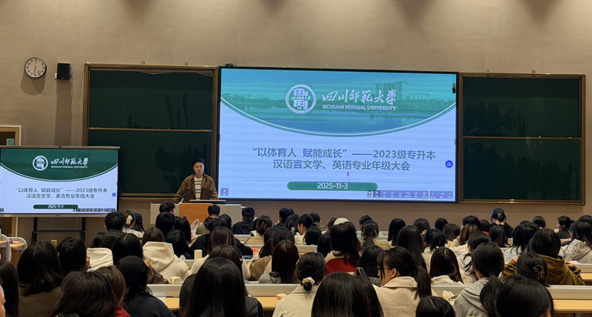 为回应学生关切、凝聚成长共识,11月3日晚上,遂宁校区行远书院2023级专升本汉语言文学、英语专业“以体育人 赋能成长”主题年级大会在至善楼110教室顺利召开。本次大会由年级辅导员钟玮老师主持,全体大三学生参会。