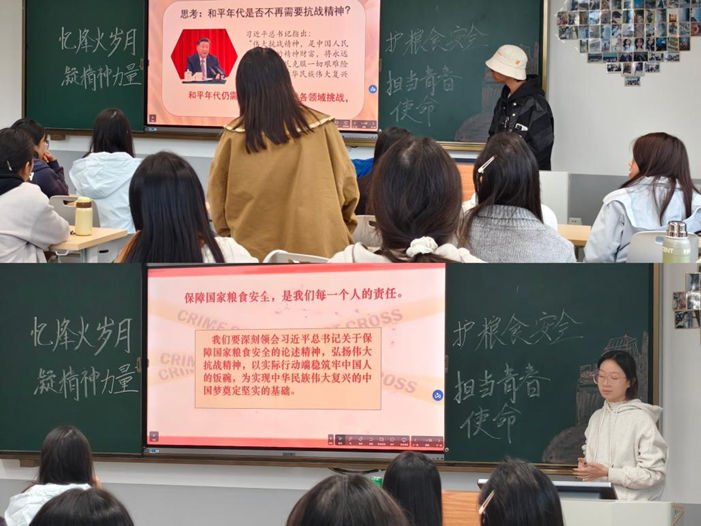 余鹏同学播放粮食安全主题视频,结合习近平总书记相关讲话,阐述“粮食安全是国之大者”;并通过抗战时期的粮食问题,从历史与现实两方面论证粮食安全的必要性。
