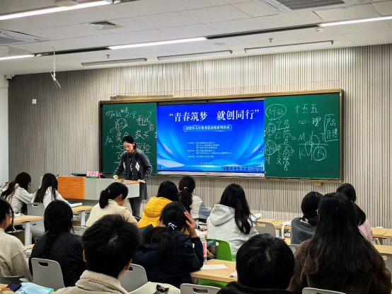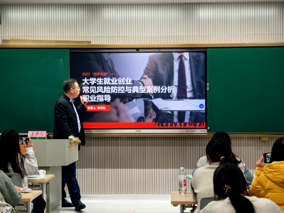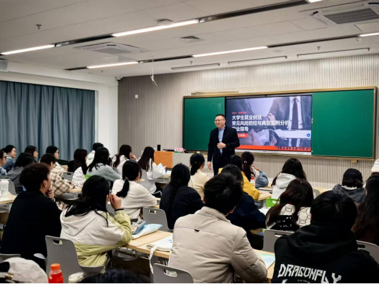 主讲人从当前就业形势出发,系统梳理了大学生在求职与创业过程中可能遇到的多种风险,包括行业选择、市场竞争、资源管理等关键问题。而后,他结合工作过程中的真实案例,系统讲解了风险识别与防控的有效方法,并引导同学们根据自身情况思考可行性应对策略。在分享过程中,车老师频繁与学生互动,现场气氛活跃,不少同学参与思考积极问答,在交流中逐步构建起对个人发展路径的清晰认知。