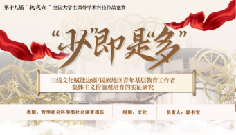 遂宁校区至善书院的广告学专业2023级学生孙艺芹、广告学专业2023级学生欧阳文婧、公共事业管理专业2023级学生陈晨共同参与的《“少”即是“多”:三线文化赋能边疆/民族地区青年基层教育工作者集体主义价值观培育的实证研究》项目在国赛中荣获三等奖。该项目团队基于当前高校师范生和边疆/民族地区青年基层教育工作者存在集体主义价值观缺失问题。以三线文化赋能为切入点,以解决边疆/民族地区青年基层教育工作者困境为导向,在多学科融合视角下,运用实地研究等多种方法,构建“三微”全生命周期培育框架,生成 “少即是多”长效固本机制,培育集体主义价值观,让三线文化在新时代焕发出新的生机活力。