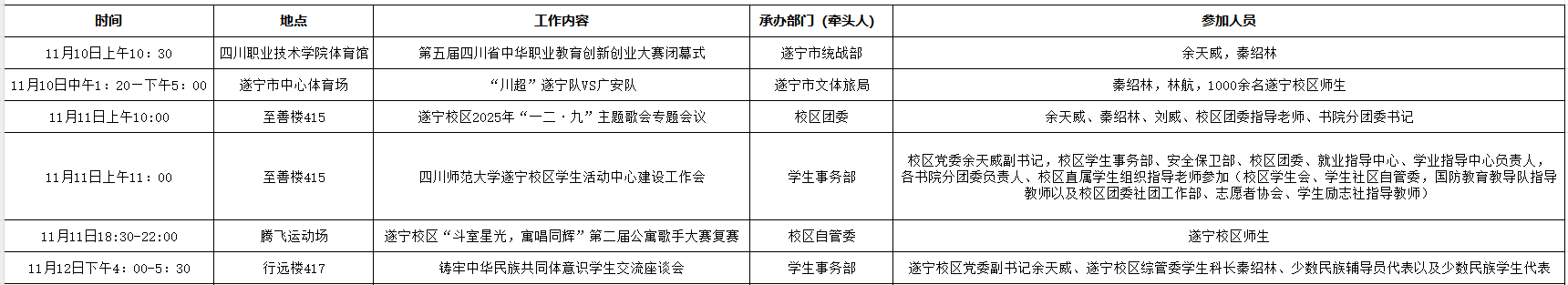 >>遂宁校区综管委学生事务部(校区团委)主要工作安排(2025年11月10日-11月16日)