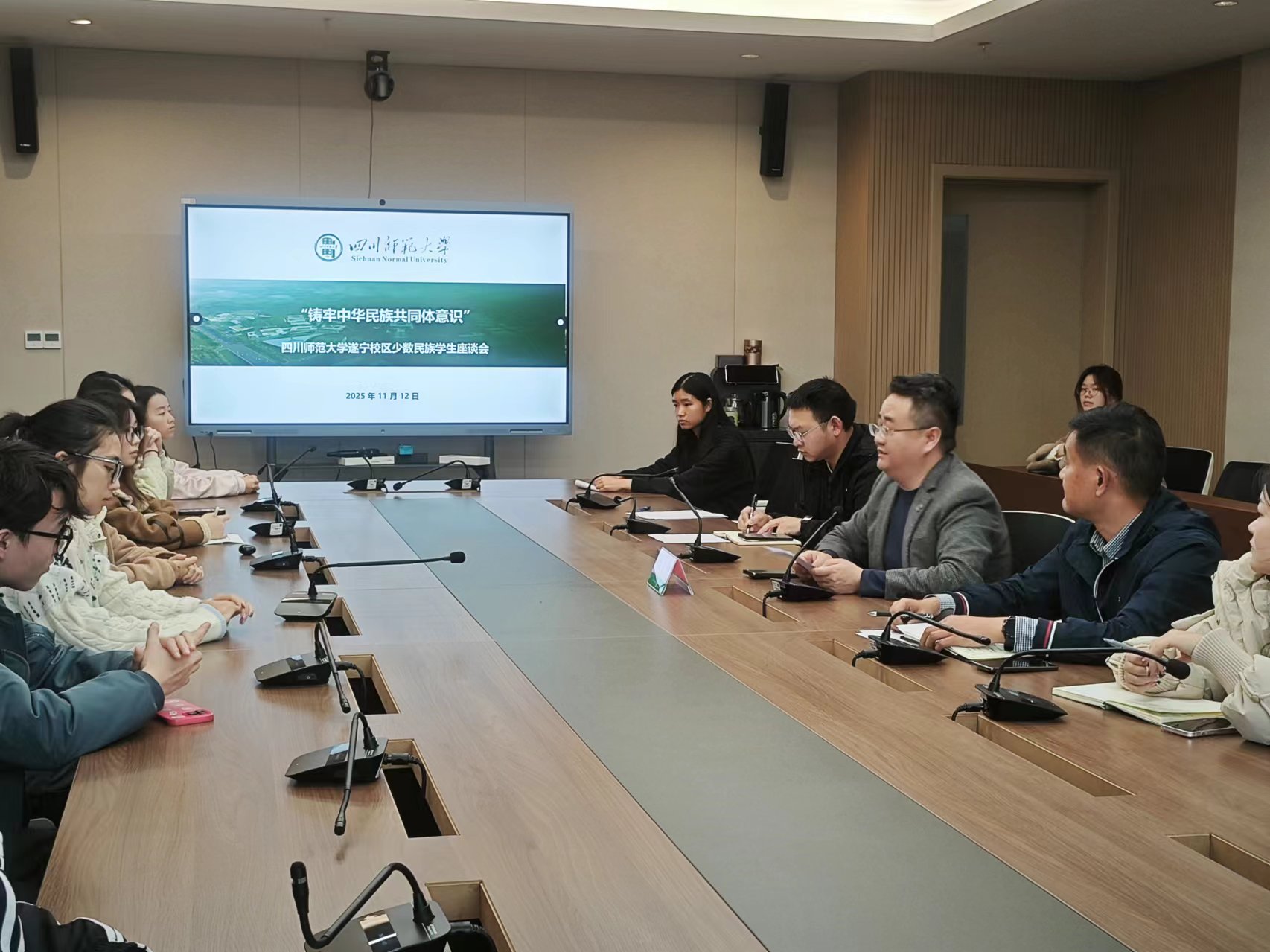为深入学习贯彻习近平总书记关于加强和改进民族工作的重要思想,深刻理解铸牢中华民族共同体意识的核心内涵,增强遂宁校区各民族同学的认同感、归属感和责任感,营造团结和谐、积极向上的校园文化氛围,11月12日下午16点,四川师范大学遂宁校区在行远楼417会议室召开铸牢中华民族共同体意识学生座谈会。