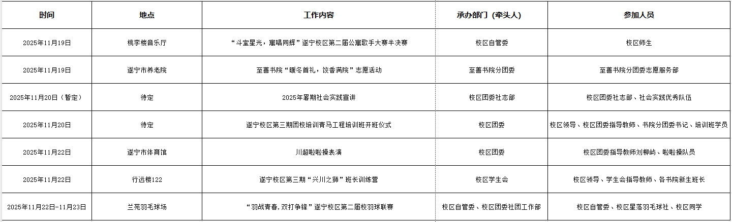 >>遂宁校区综管委学生事务部(校区团委)主要工作安排(2025年11月17日-11月23日)
