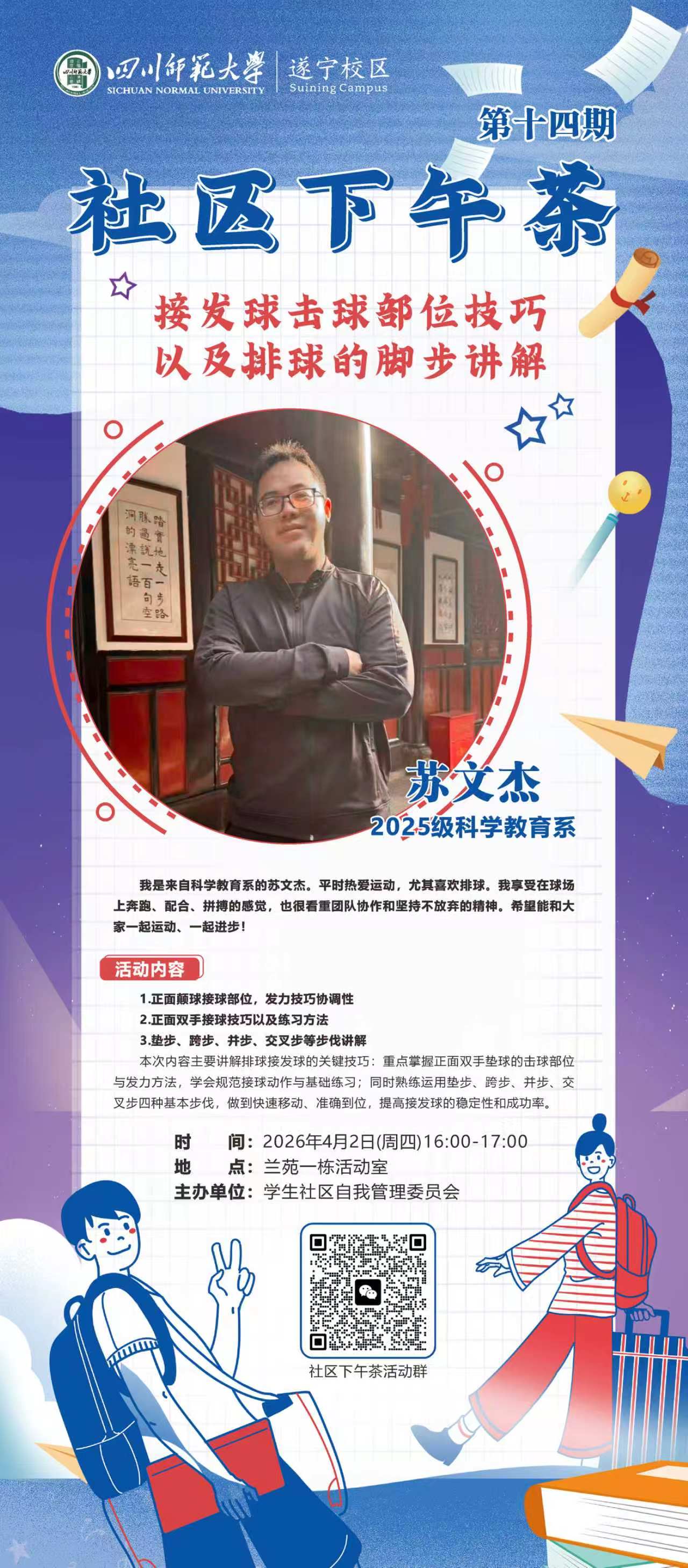 为丰富学生社区文化生活,提升同学们的身体素质和运动技能,进一步落实“五育并举”育人理念,推动体育育人走深走实,4月2日下午,四川师范大学遂宁校区学生社区自我管理委员会于兰苑一栋活动室组织开展第十四期学生社区下午茶活动,主题为“接发球击球部位技巧以及排球的脚步讲解”。本期活动邀请到的主讲人是2025级科学教育系的苏文杰同学。