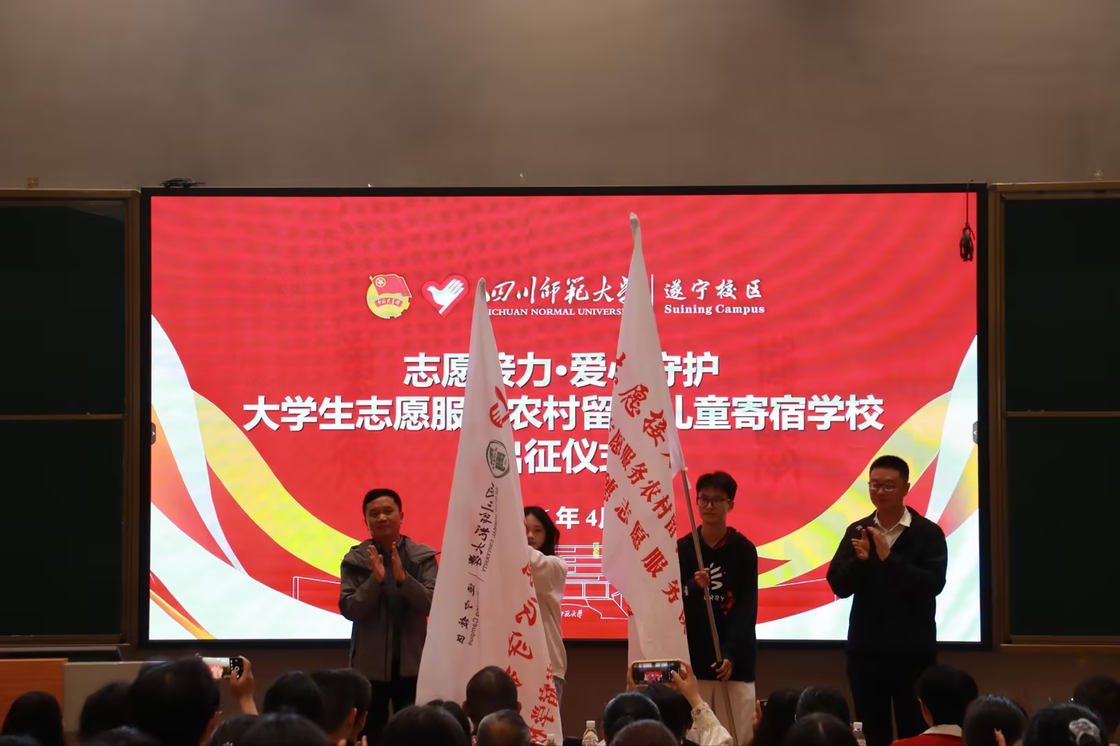 出征仪式上,梁识栋与饶显周共同为遂穗志愿服务队授旗。梁识栋局长在讲话中强调,志愿者们要以实际行动践行“奉献、友爱、互助、进步”的志愿精神。同时他提出三点要求:一是精准对接需求。各试点学校要细化留守儿童个性化需求,建立需求清单,与高校做好精准对接;二是强化协同配合。市县教育部门要做好统筹协调、服务保障,组建“教师+志愿者”双关爱队伍,推动资源共享、合作共进;三是健全长效机制。完善志愿服务时长认定、考核评估等全环节管理,做好服务档案记录,以制度优化服务。