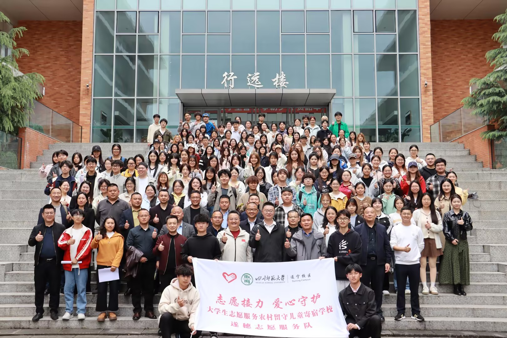 为积极响应遂宁市委、市政府的号召,市教育局、共青团遂宁市委、四川师范大学遂宁校区扎实推进“志愿接力·爱心守护”大学生志愿服务农村留守儿童寄宿学校工作。2026年4月8日下午,“志愿接力·爱心守护”大学生志愿服务农村留守儿童寄宿学校项目出征仪式在四川师范大学遂宁校区至善楼110室举行。遂宁市委教育工委书记、市教育局党组书记、局长梁识栋,遂宁校区党委常务副书记饶显周、各区县教育局及试点学校负责人,校区团委指导教师及桃李书院全体辅导员、志愿者学生共同参会。出征仪式由遂宁校区党委副书记余天威主持。
